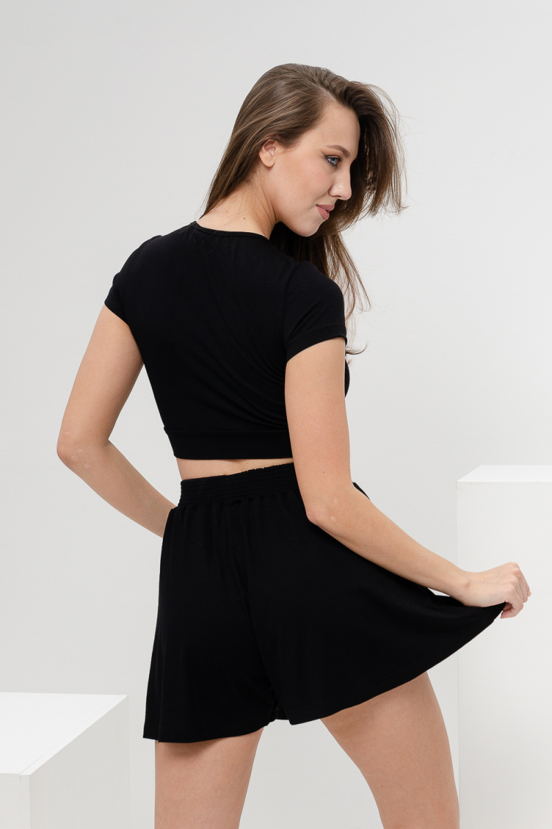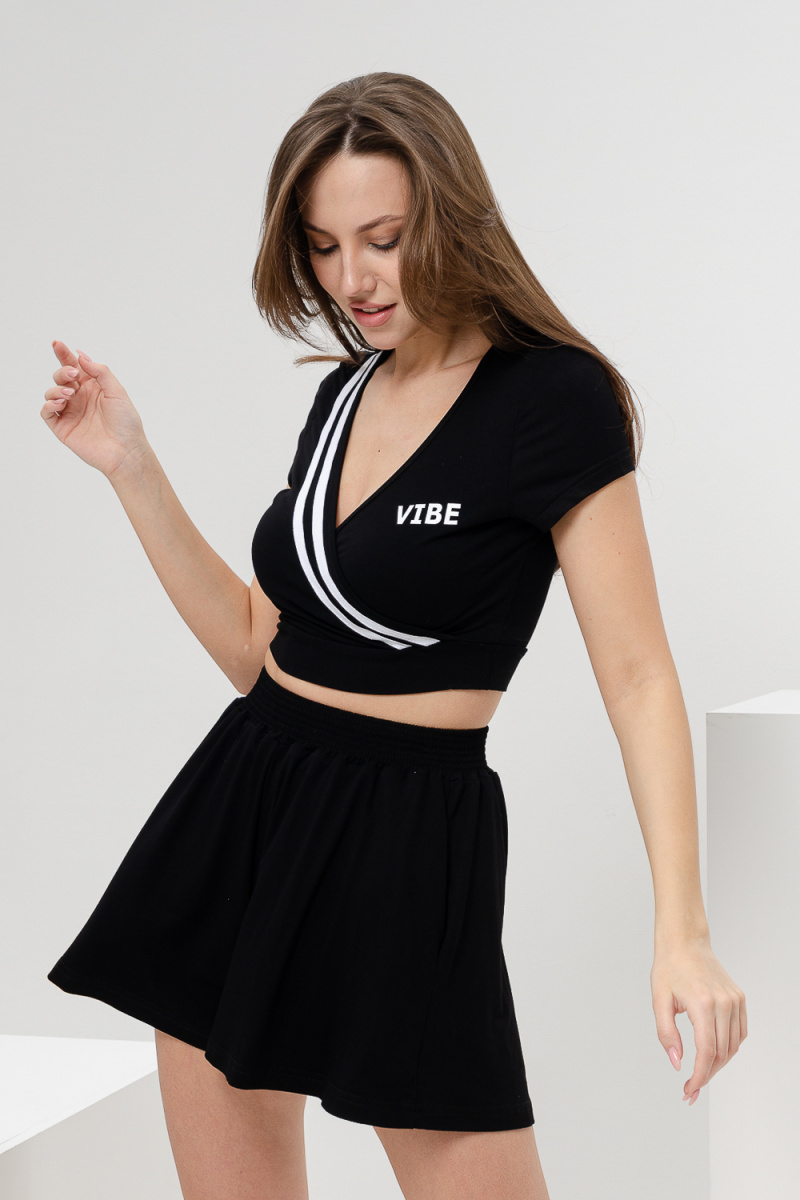 Комплект состоит из топа и шорт. Топ с V-образной горловиной, с коротким рукавом, с поясом по низу, длиной выше линии талии. Вдоль линии запаха правой полочки расположены лампасы контрастного цвета. Горловина обработана бейкой из основного полотна. Шорты-юбка расклешенные, короткие, с боковыми карманами, на эластичном поясе.